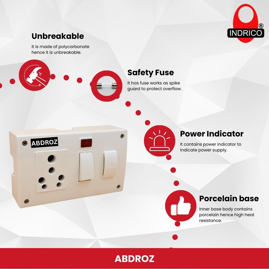 Materials: ABDROZ 5 in 1 Surface Junction Box with Individual Switch and Fuse, Indicator 6 Amp/16 Amp 240 Volts is made of polycarbonate hence it is unbreakable. Inner base body contains porcelain hence high heat resistance. Brass connectors make the product safest from electrical fluctuations.